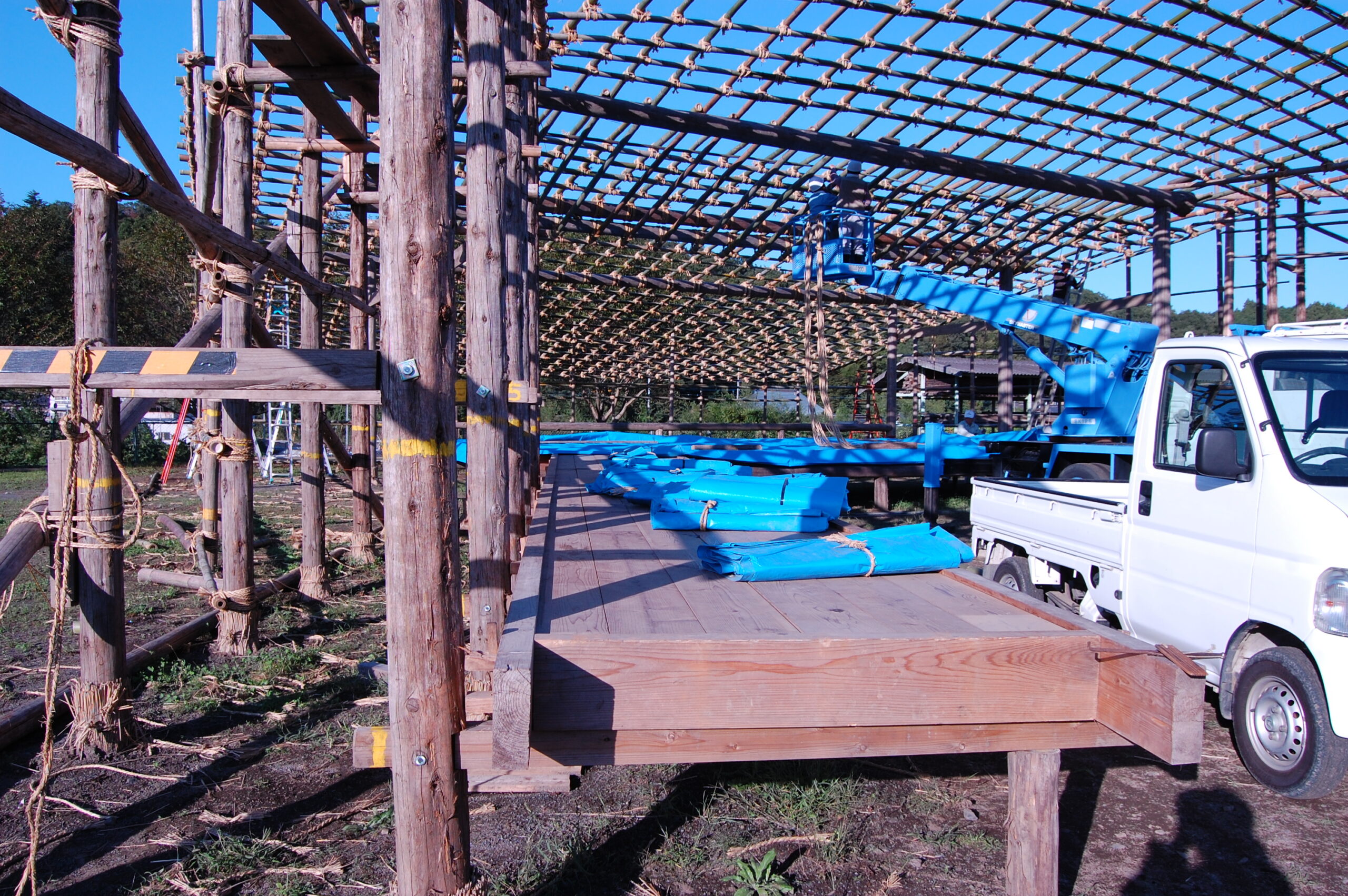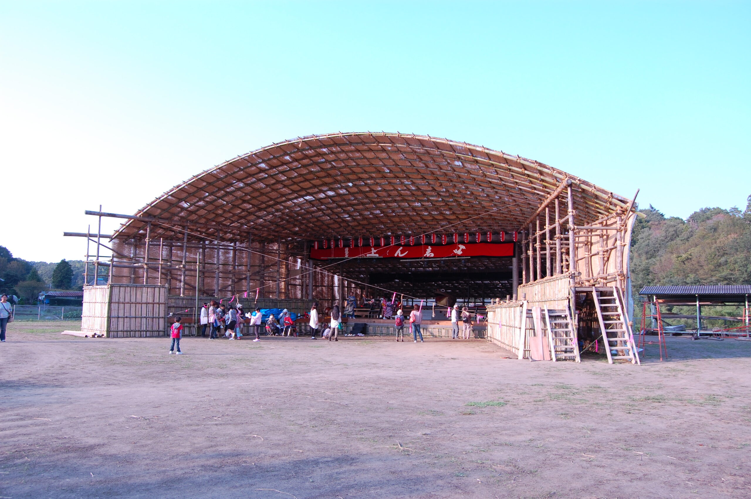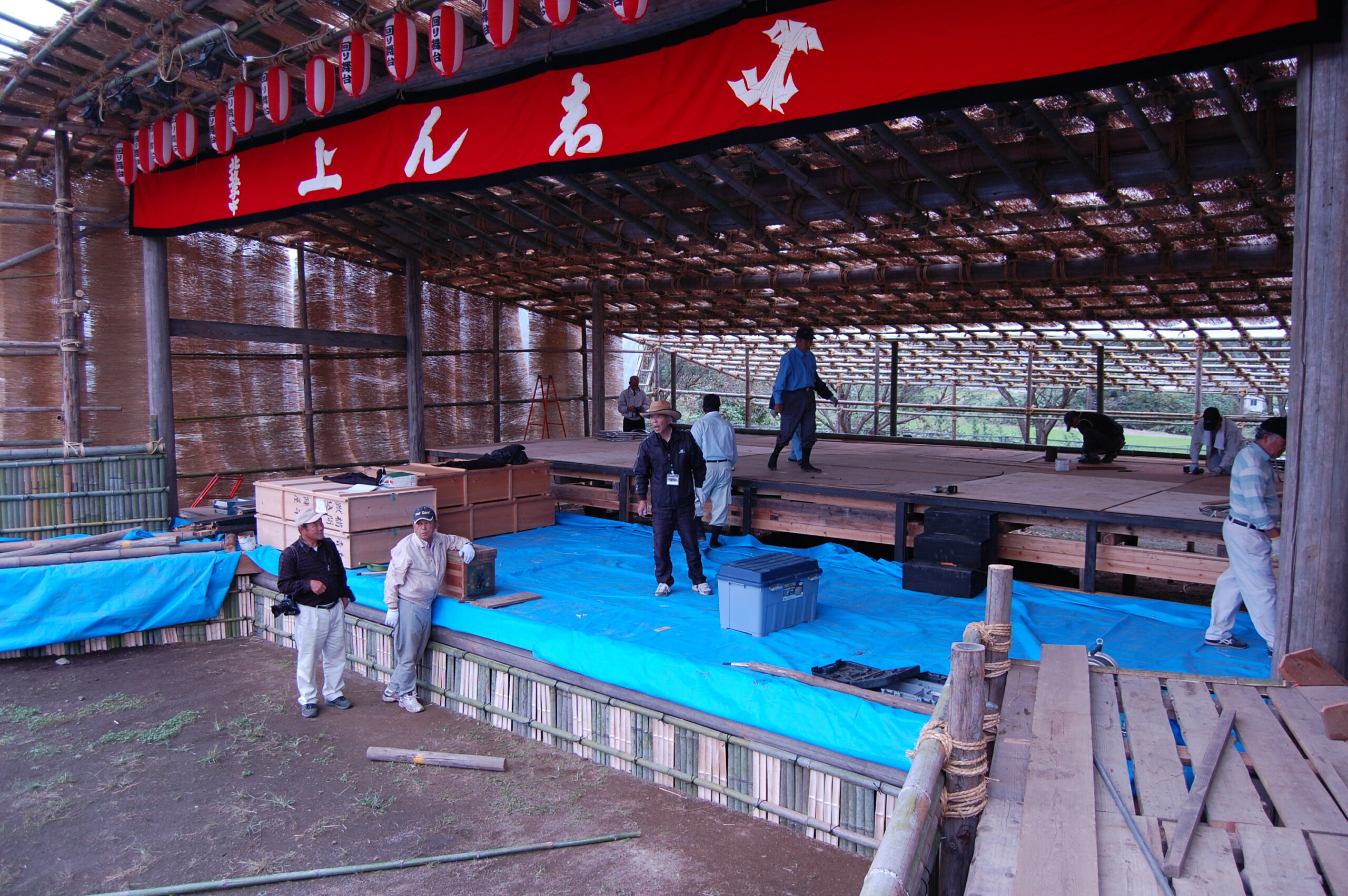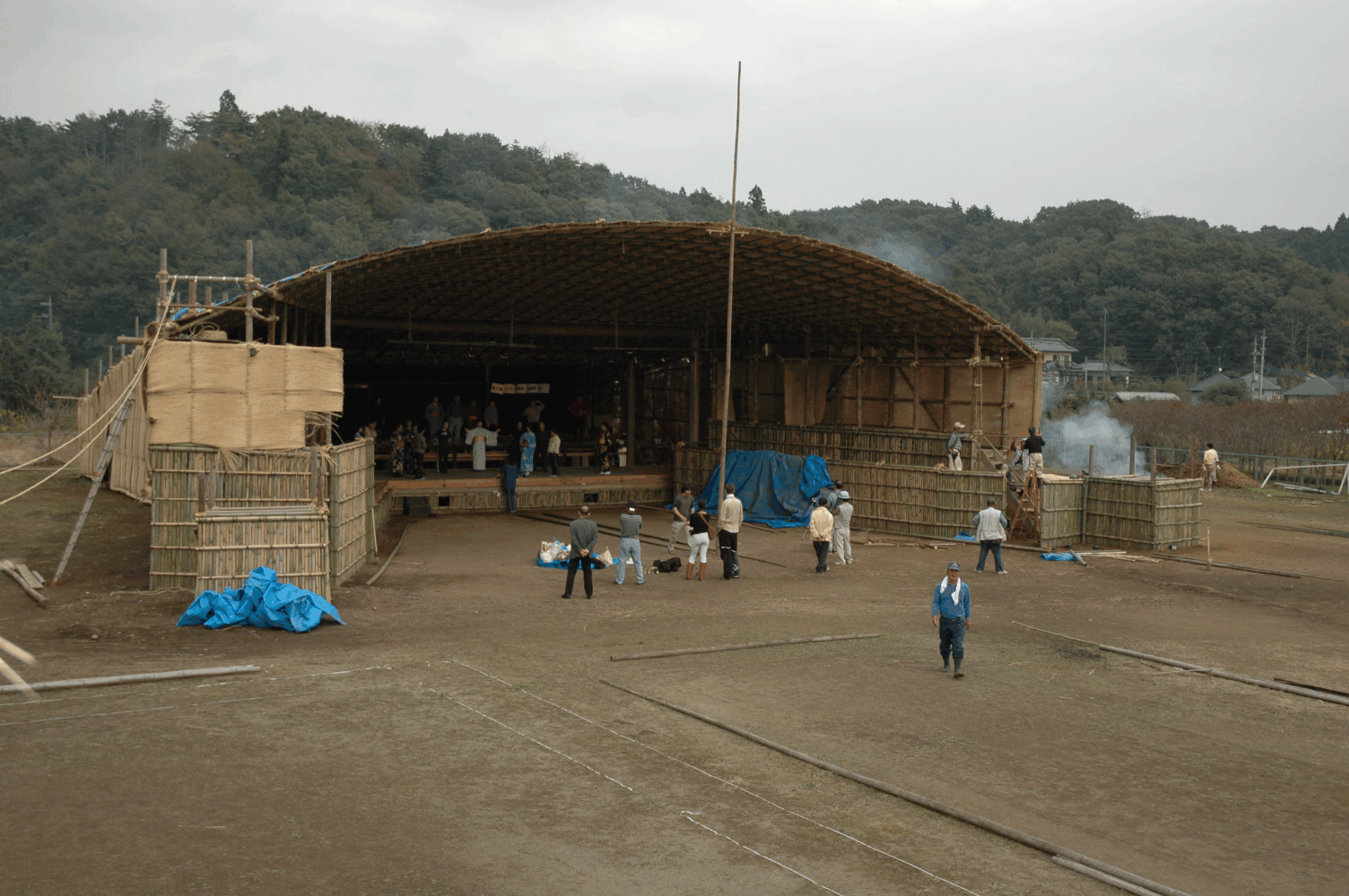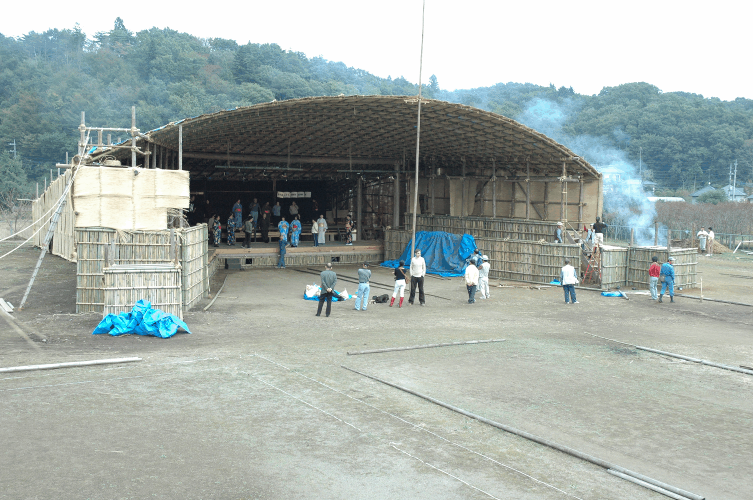「西塩子(にししおご)の回り舞台」(茨城県有形民俗文化財指定)とは、ここ茨城の小さな里山~茨城県常陸大宮市西塩子地区で、200年ものあいだ受け継がれてきた、現存する日本最古の“組立式農村歌舞伎舞台”です。「回り舞台」を有し、大がかりな舞台ながらも「組立式」。公演後にはなんと潔く取り壊されて更地に戻されます。