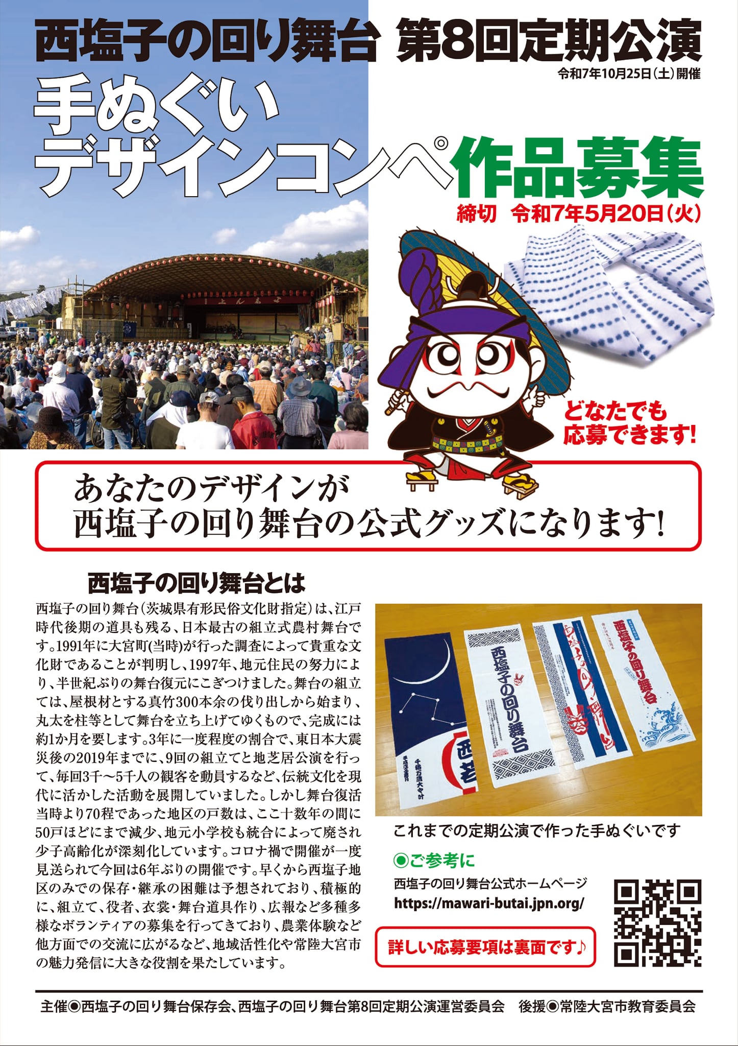 西塩子の回り舞台第8回定期公演開催にあたり、公式グッズとなる手ぬぐいのデザインを募集します。大賞となったデザインは実際に制作し、販売されます!どなたでも応募できますので、ぜひご参加ください。