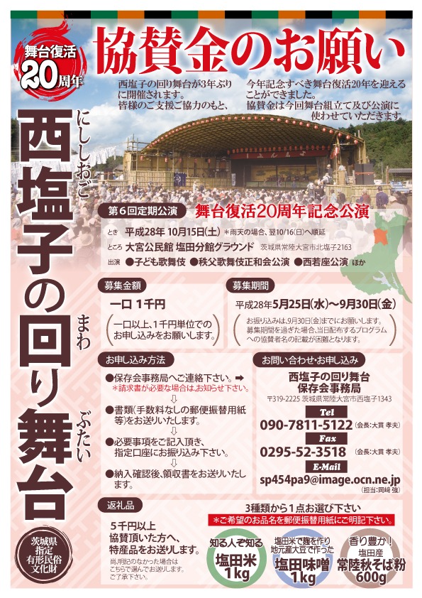 西塩子の回り舞台が3年ぶりに開催されます。 皆様のご支援ご協力のもと、今年記念...