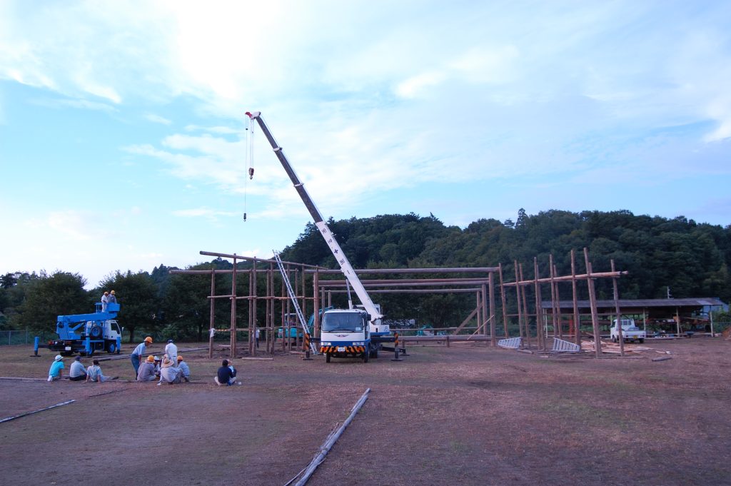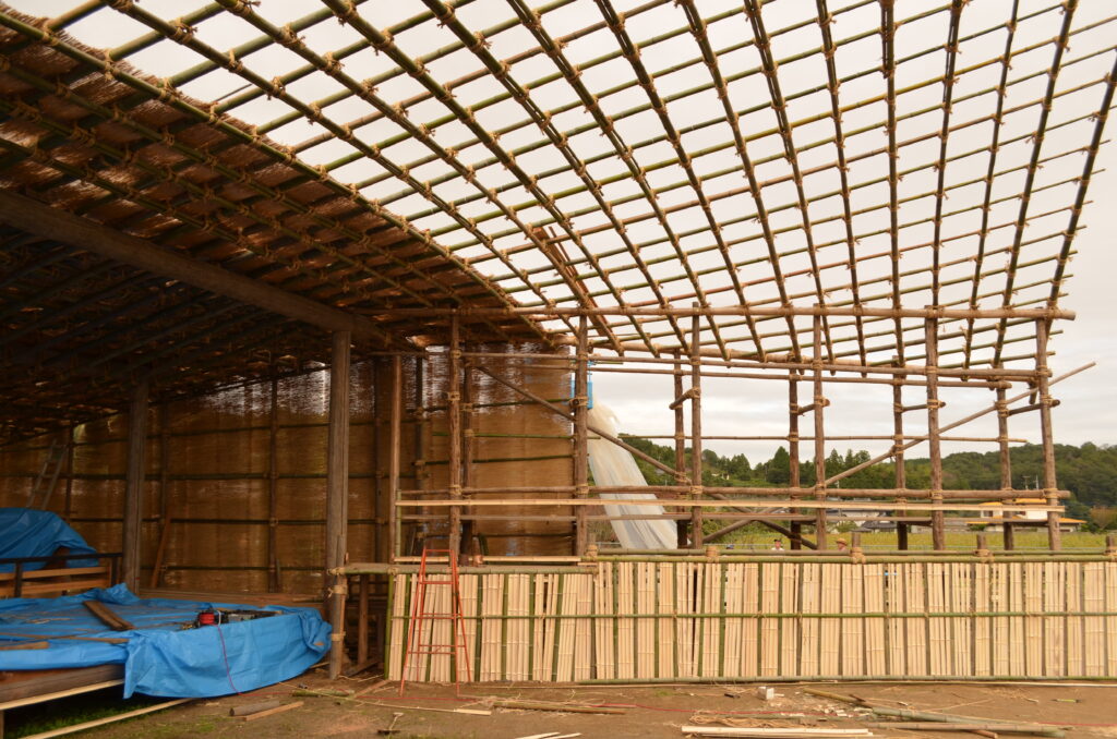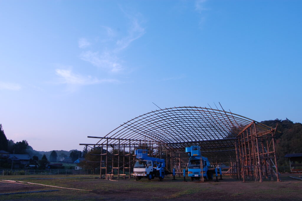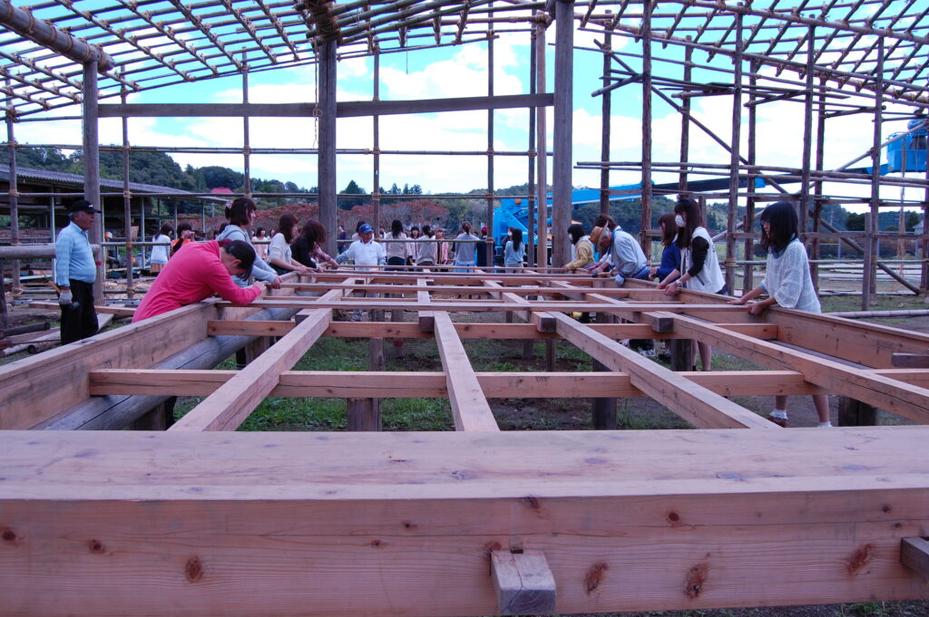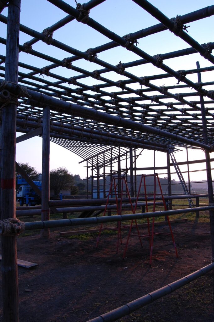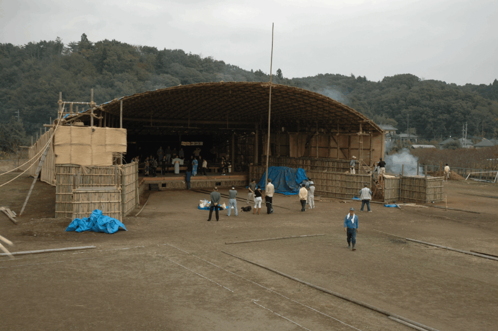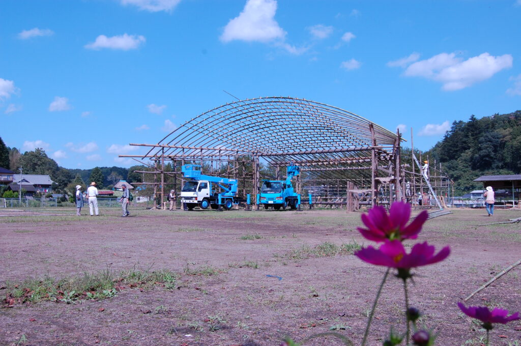 2019年稲刈り体験イベントにて ボランティアによる舞台組み立て作業
