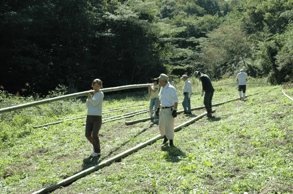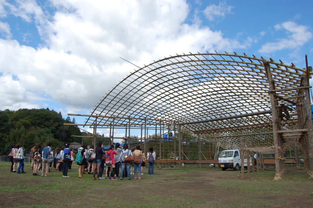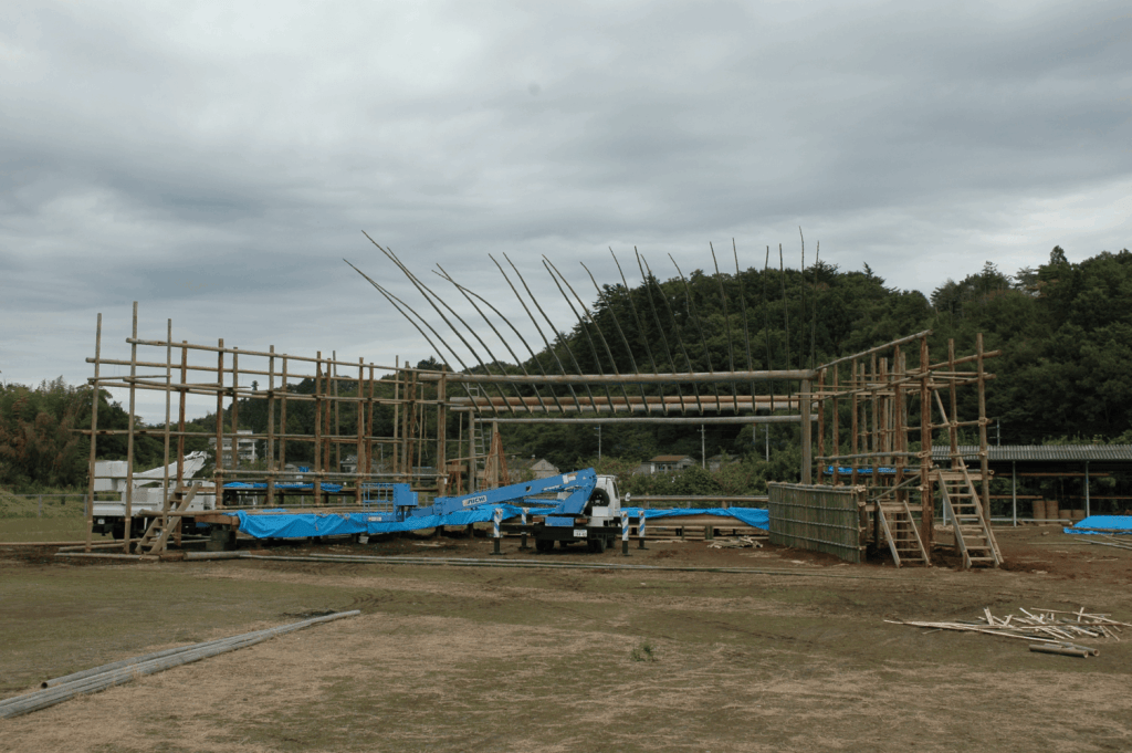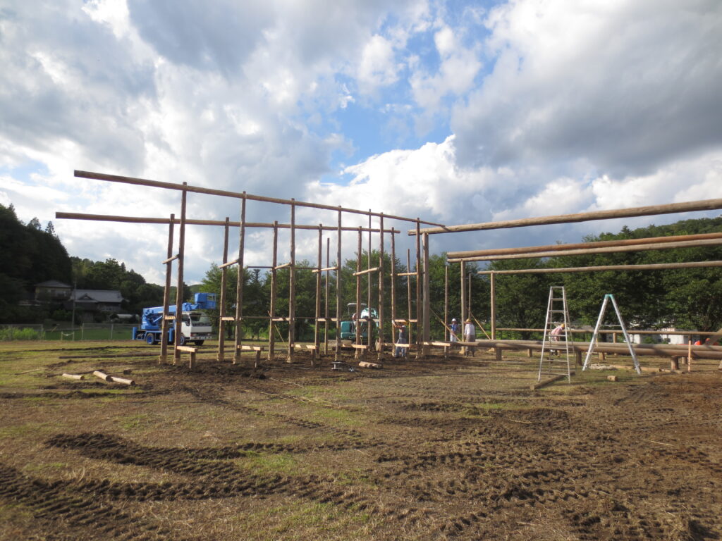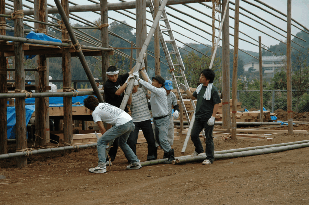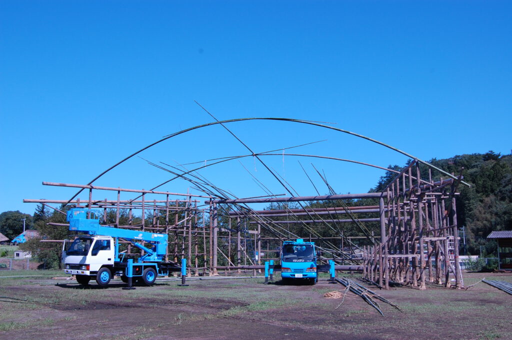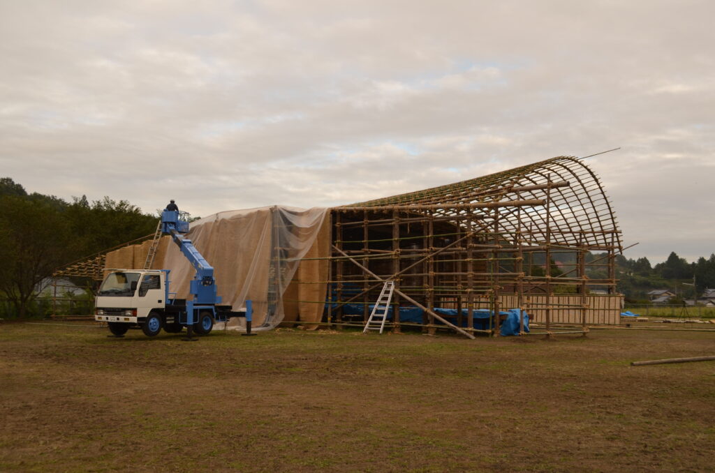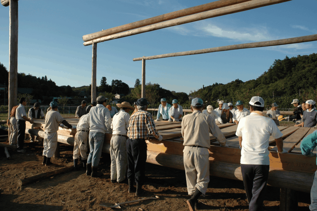 2019年稲刈り体験イベントにて ボランティアによる舞台組み立て作業