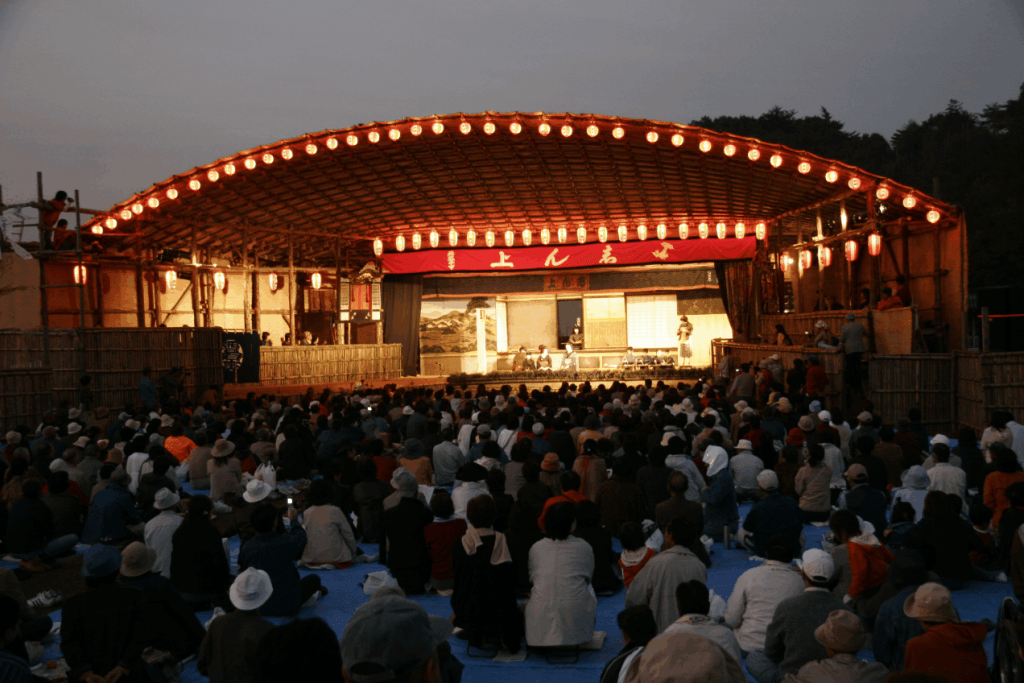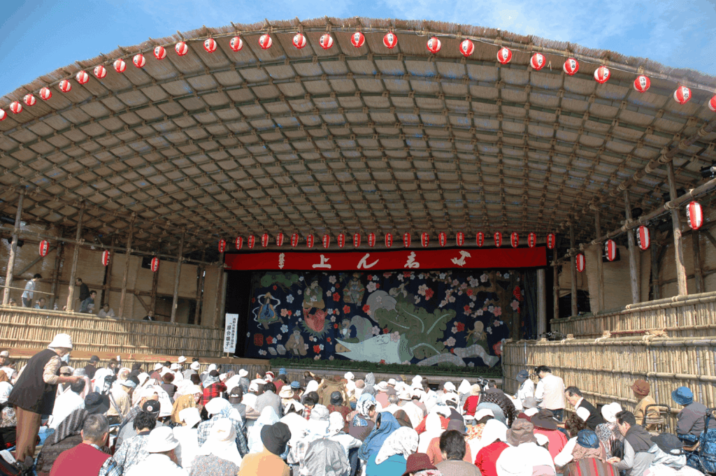 西塩子の舞台を使った玉川村(現常陸大宮市東野)青年団による地殿神社の遷宮芝居。/昭和18年頃