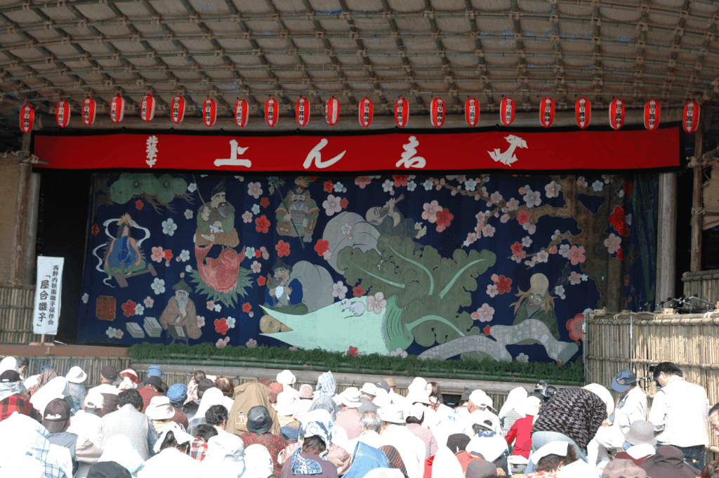 門井の舞台の大幕。縁起の良い初夢「一富士、二鷹、三茄子」を題材としたもの。